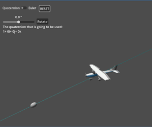 Una volta aver creato l’asse di rotazione, sarà possibile utilizzare uno slider che permette di decidere di quanti gradi ruotare l’aereo. Per ogni angolo, verrà mostrato in basso il quaternione che verrebbe applicato per quella specifica rotazione.